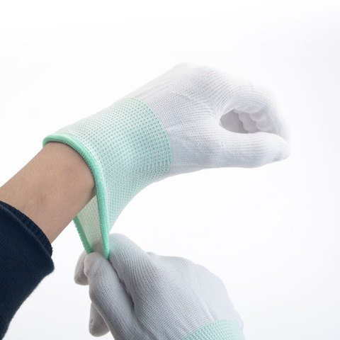 ถุงมือป้องกันเคลือบไนลอนป้องกันไฟฟ้าสถิตย์ระบายอากาศได้ ถุงมือนิรภัยที่ทนต่อการสึกหรอสำหรับงานอิเล็กทรอนิกส์ โรงงานในสวน งานในโรงงาน